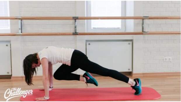 Исходное положение — классическая планка на прямых руках. Далее подтягиваем левое колено к левому локтю, а правое, соответственно, к правому. Стремимся сохранить прямую линию, живот подтянут, взгляд направлен вперед.