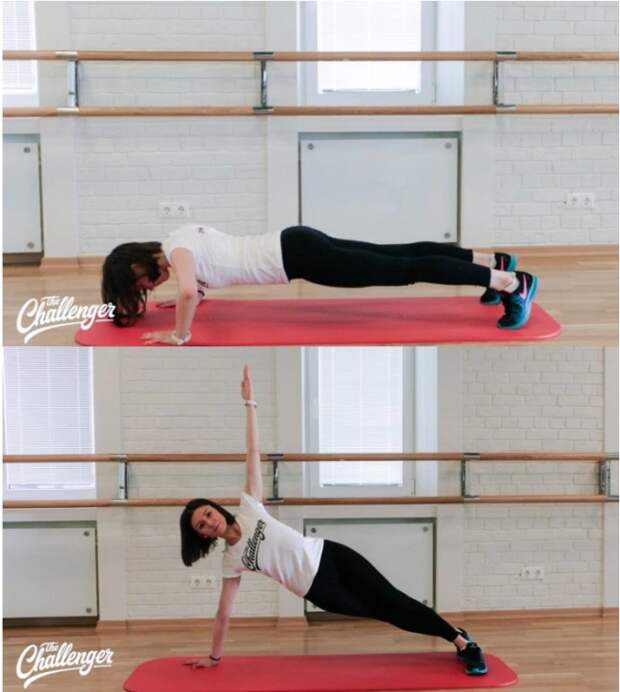 Из положения «упор лежа», согнув руки в локтях, принимаем положение, при котором наше тело параллельно полу. Задерживаемся на несколько секунд, затем возвращаемся в упор лежа и переносим вес на правую сторону, левую руку отводим в сторону, принимая боковую планку.