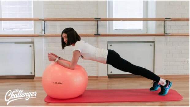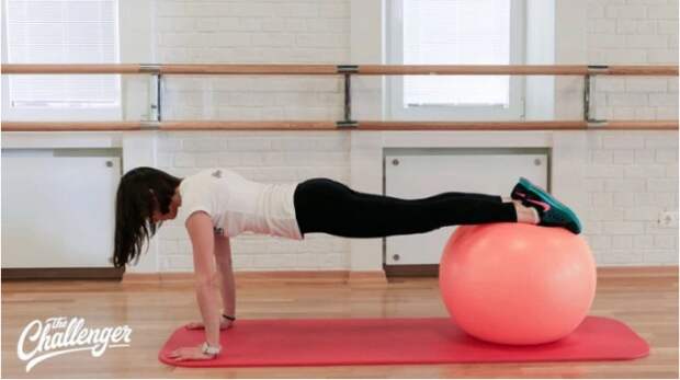 Принимаем исходное положение планки на вытянутых руках, поднимаем тело и держим его прямо, опираясь пальцами стоп на фитбол. Важно следить за тем, чтобы поясница не прогибалась, мышцы пресса и ягодиц находились в постоянном напряжении, а живот был втянут.