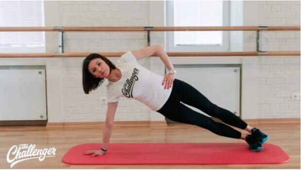 Исходное положение — боковая планка. Медленно опускаем правое бедро на пол. Затем принимаем исходное положение, не забываем соблюдать прямую линию, таз держим ровно. Данный вариант помимо нагрузки на косые мышцы живота увеличивает нагрузку на плечевой пояс.